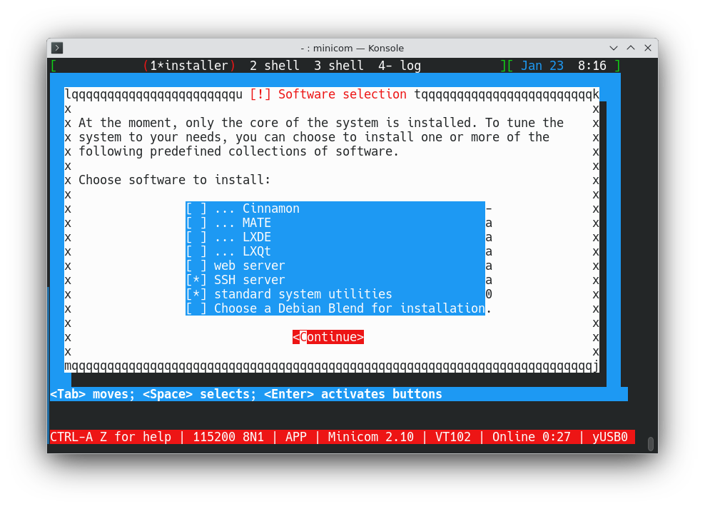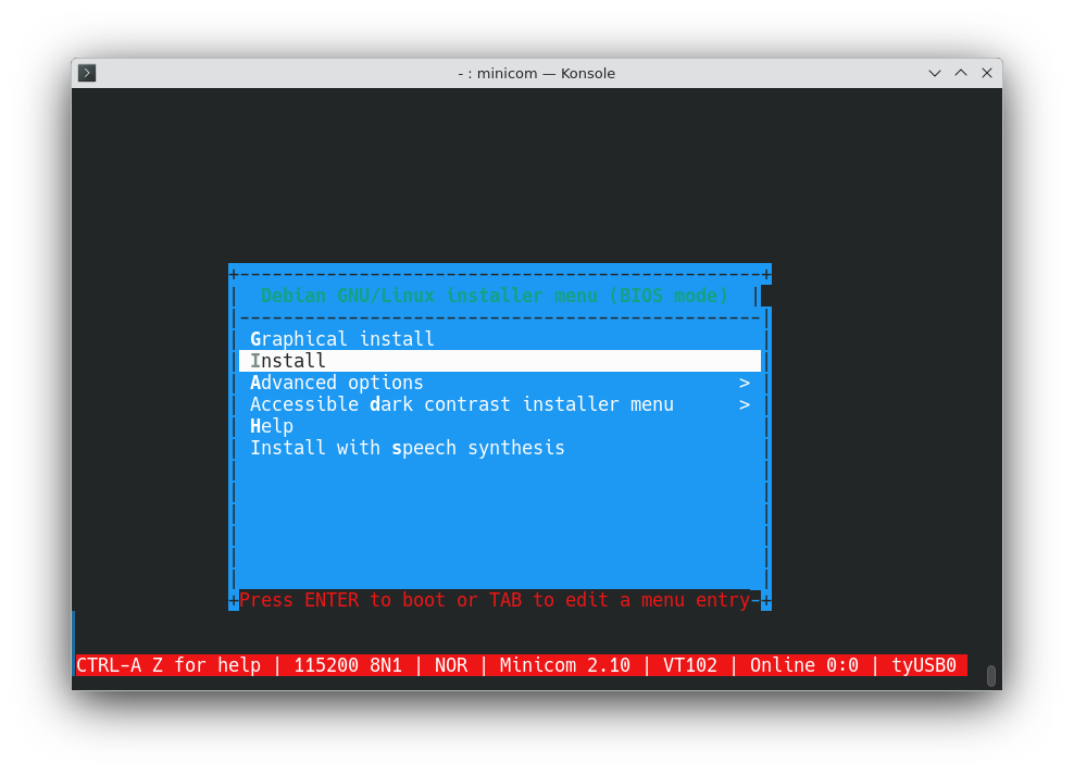 Je ne détaille pas ici la confection d'une clé USB d'installation de Debian, qui est une tâche triviale. Voici ce qu'il faut faire tout en gardant l'affichage de Minicom dans le terminal du PC :