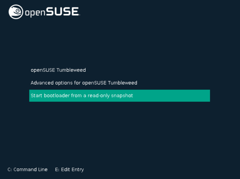 À présent, je redémarre le système en activant l'état avant la mise à jour. Lorsque le gestionnaire de démarrage GRUB s'affiche, j'interromps la procédure de démarrage normale et je sélectionne l'option Start bootloader from a read-only snapshot :