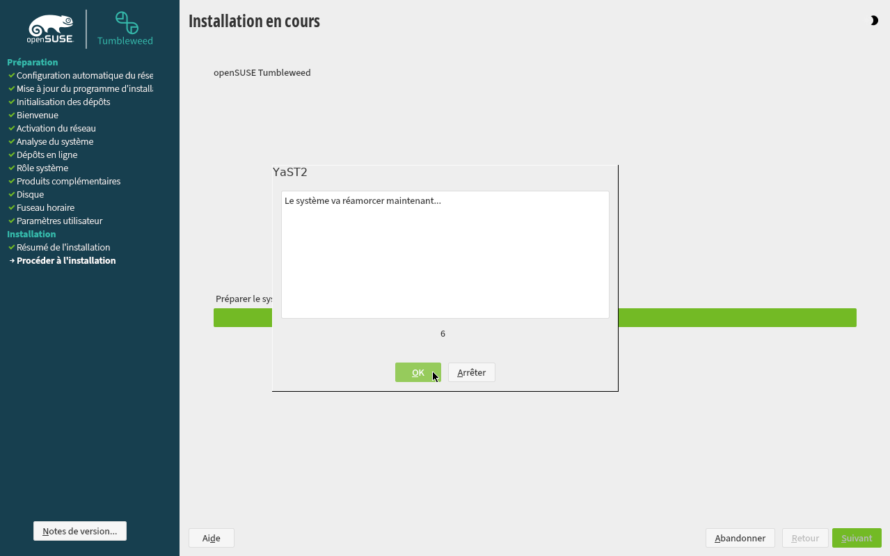 Notre poste de travail OpenSUSE Tumbleweed KDE est installé. Il ne reste plus qu'à le prendre en main et à le peaufiner aux petits oignons, ce qui fera l'objet d'une série d'articles à venir.