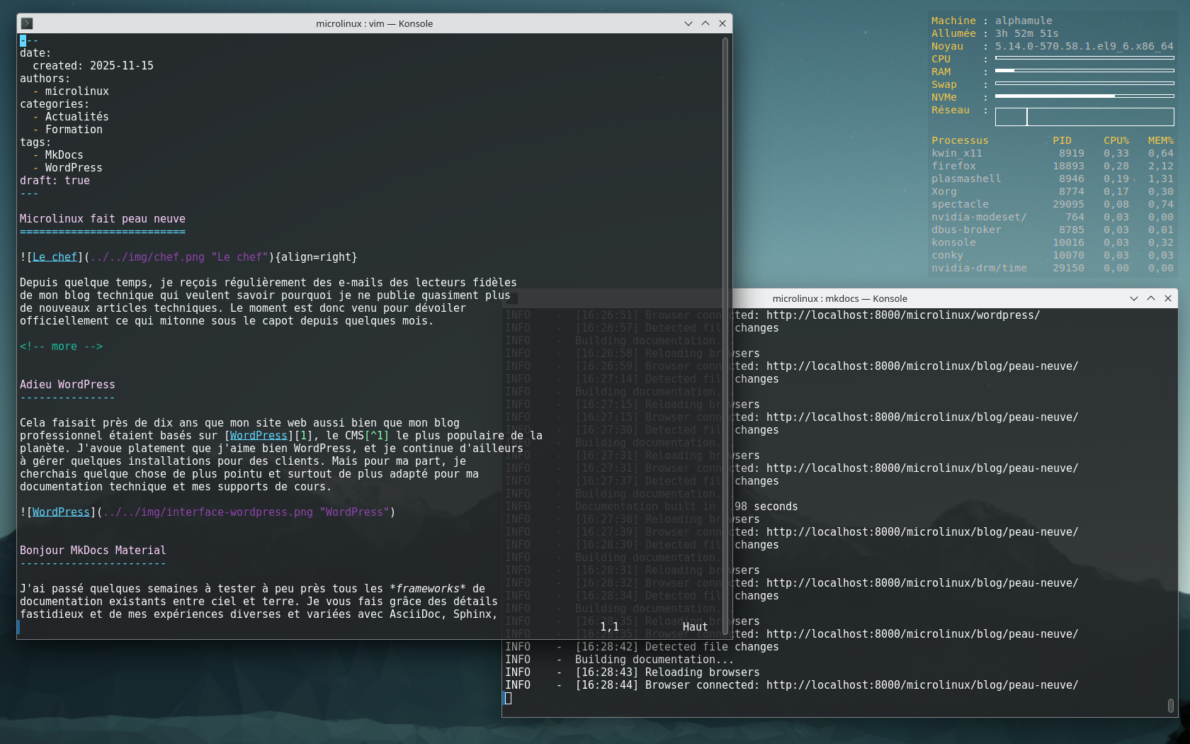 Cela faisait près de dix ans que mon site web aussi bien que mon blog professionnel étaient basés sur WordPress, le CMS1 le plus populaire de la planète. J'avoue platement que j'aime bien WordPress, et je continue d'ailleurs à gérer quelques installations pour des clients. Mais pour ma part, je cherchais quelque chose de plus pointu et surtout de plus adapté pour ma documentation technique et mes supports de cours.