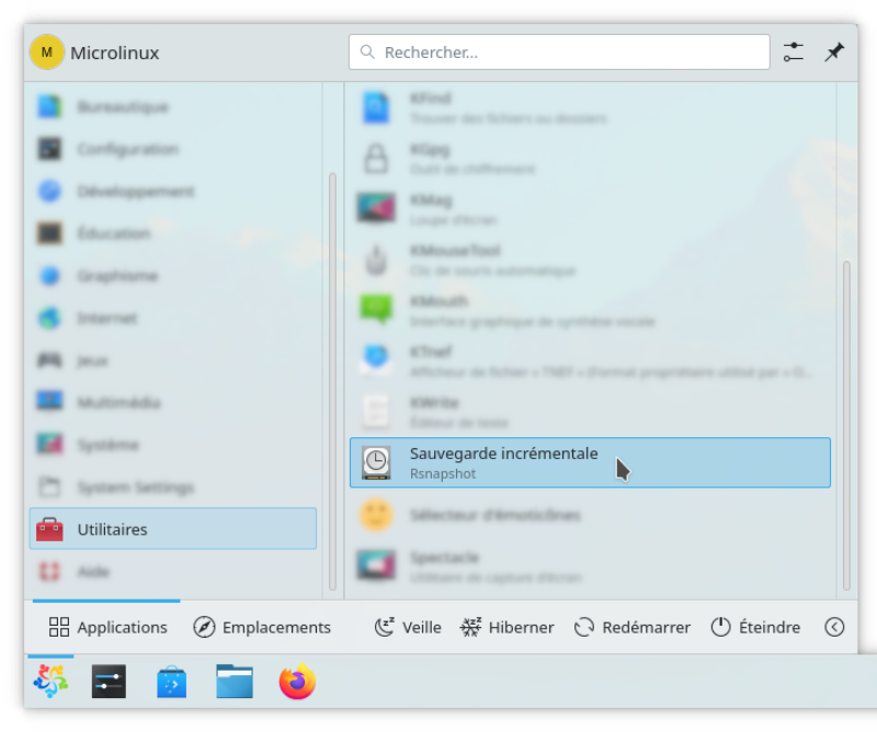 Dans mon bureau KDE, je retrouve désormais mon petit programme Sauvegarde incrémentale dans la rubrique Utilitaires :