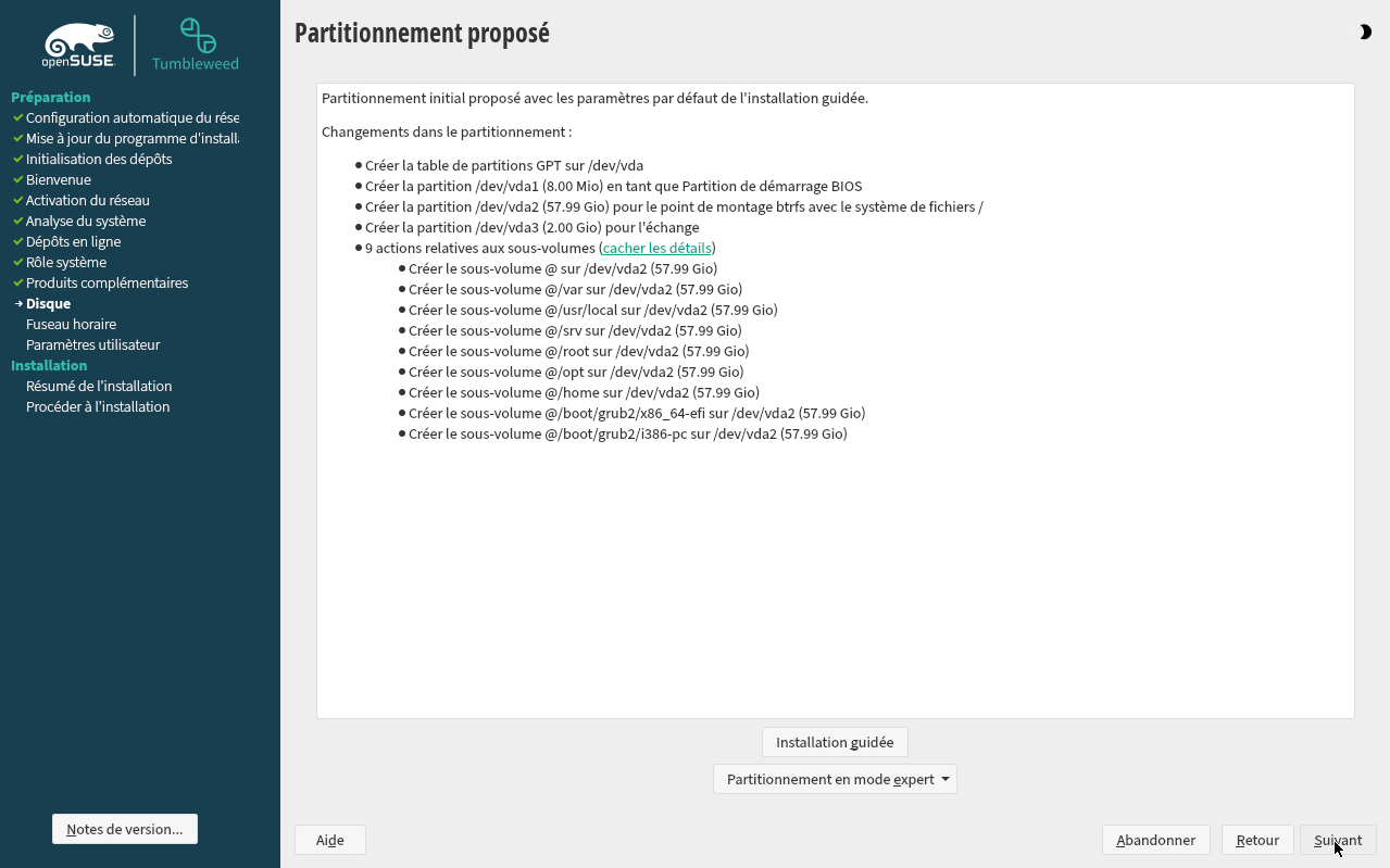 Dans la configuration par défaut, l'installateur propose un schéma de partitionnement basé sur le système de fichiers Btrfs. Cliquez sur Détails pour en savoir un peu plus et acceptez cette configuration :