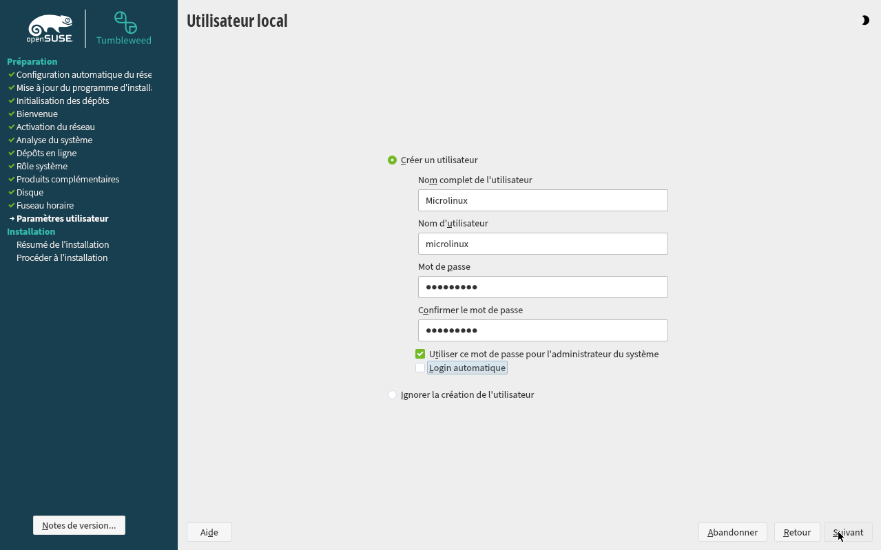 Ensuite, on passe à la création de l'utilisateur initial. Rien de spécial à signaler ici, mais on veillera bien à décocher l'option Login automatique, qui est une aberration en termes de sécurité :
