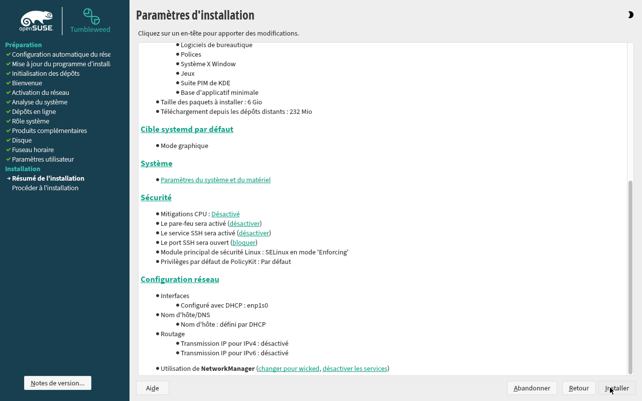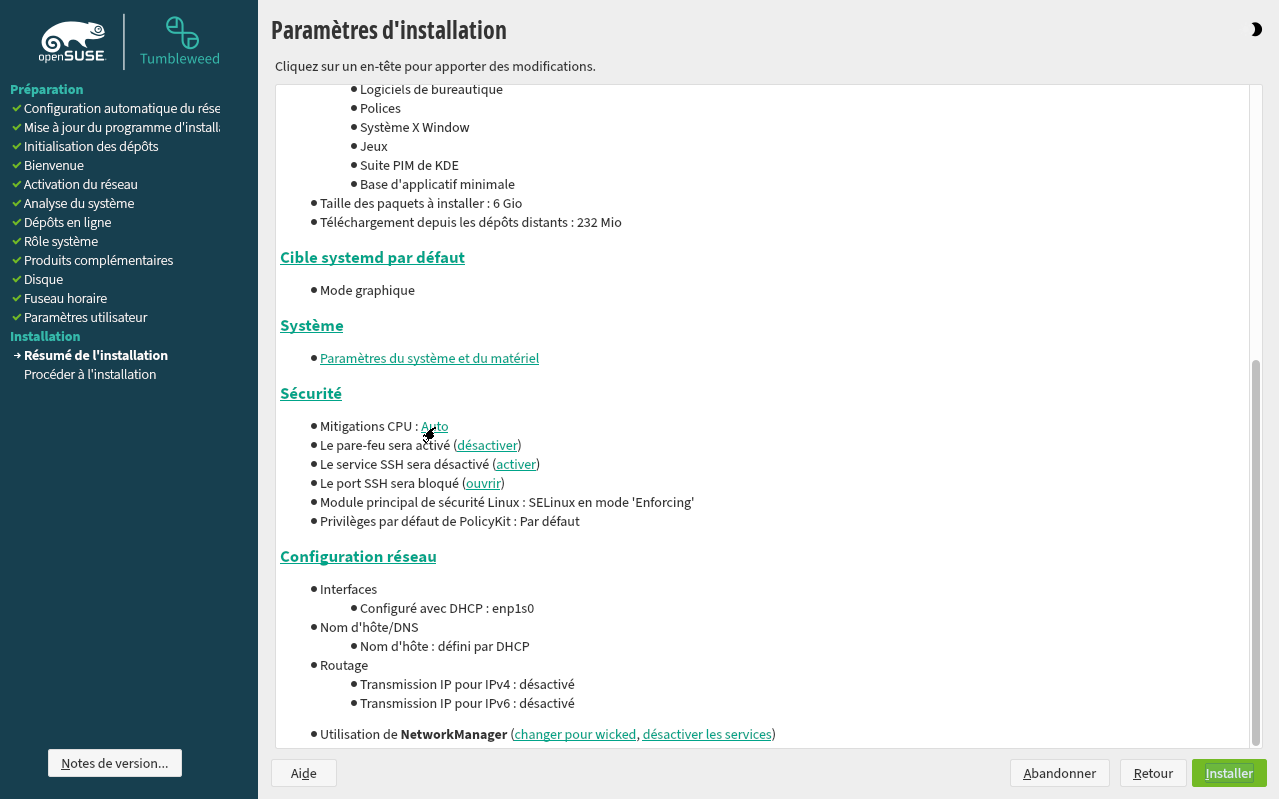 On arrive finalement à l'écran qui affiche un récapitulatif complet des paramètres d'installation :