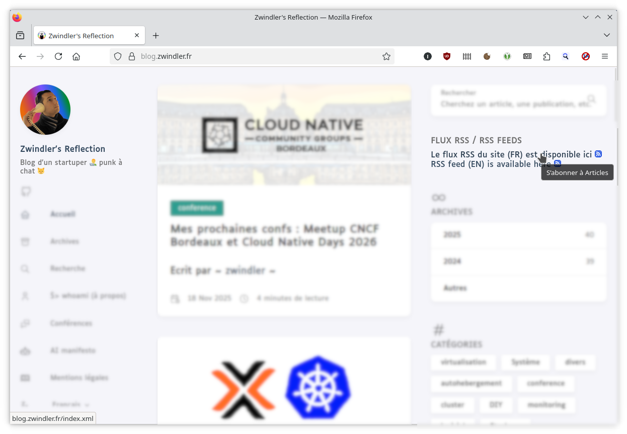 J'aime bien le blog Zwindler's Reflection maintenu par Denis Germain, un expert en matière de Proxmox, Kubernetes et tout un tas de nouvelles technologies. Si ces termes techniques ne vous disent rien, ne vous en faites pas. Retenez simplement le fait que je lis régulièrement ce blog, et j'aimerais bien être au courant des dernières publications.